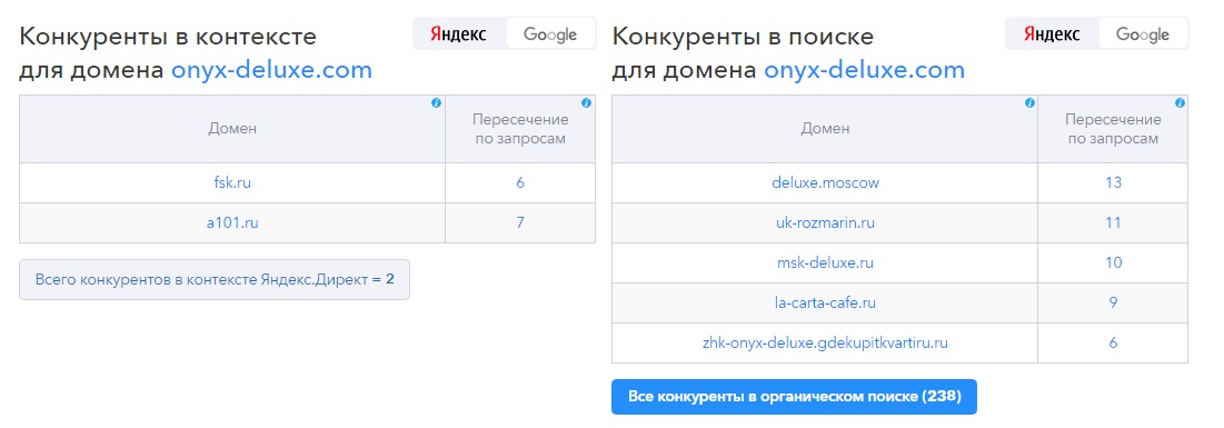 В анализе конкурентов введем свой домен. Спускаемся к таблице «Конкуренты в контексте для домена onyx-deluxe.com».